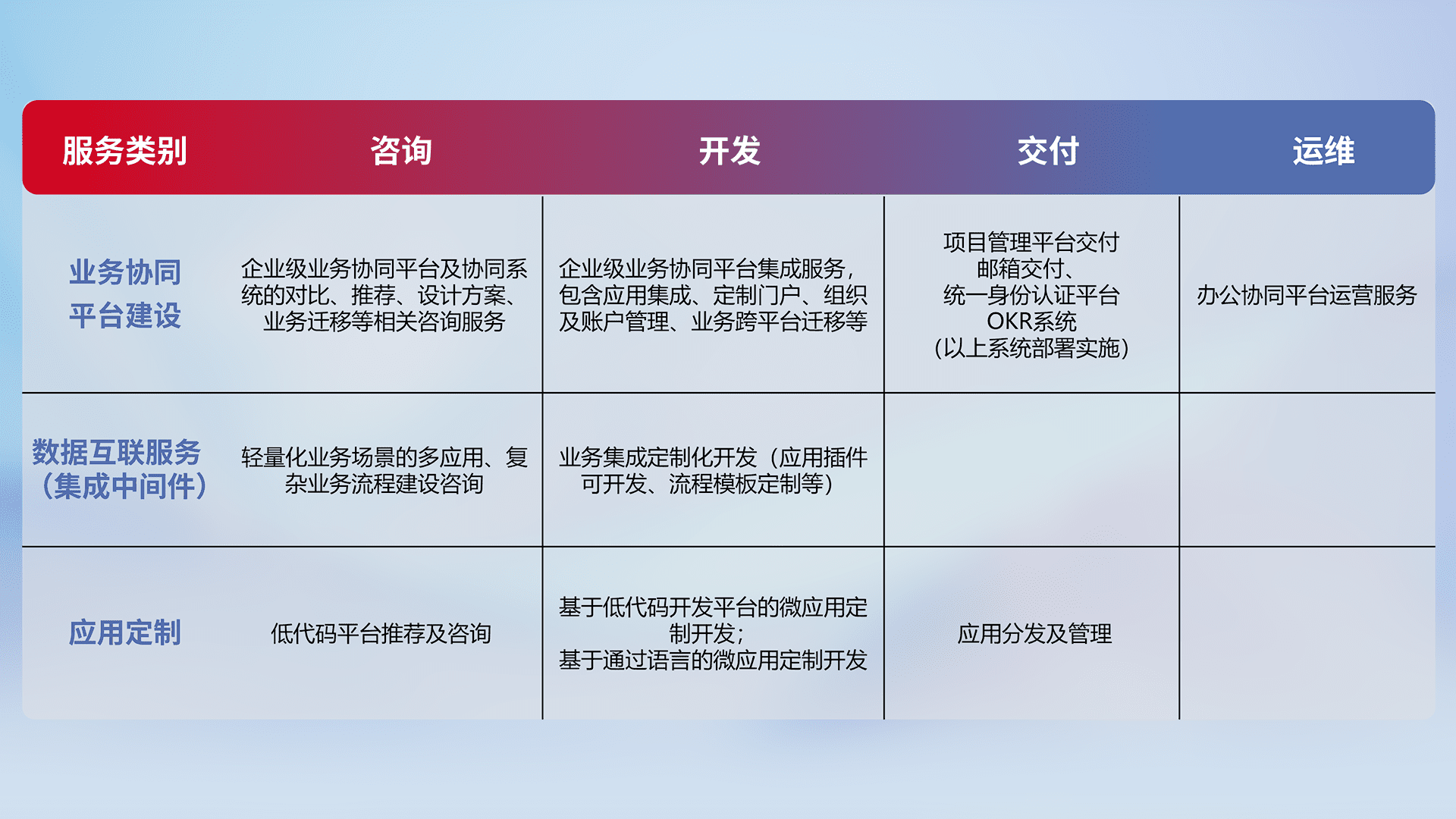 针对钉钉、、企微、、IDaas等平台级产品提供产品的规划、、方案、、交付、、、、定制化开发等服务,,实现如统一协同办公、、智能客户服务、、、、混合会议管理、、智能数据查询、、、等业务场景,,,实现数字化转型。。